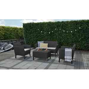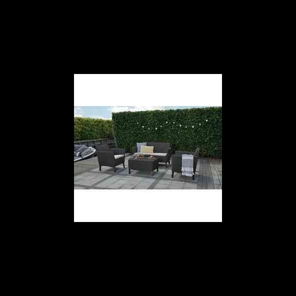 in resina antiurto effetto soft rattan, con cuscini 7mm, piedini rialzati, tavolo contenitore di grandi dimensioni, seduta ergonomica. Composto da divano 133x66,5xh76cm due poltrone 79x66,5xh76cm tavolo 76,5x56,5xh41,5cm