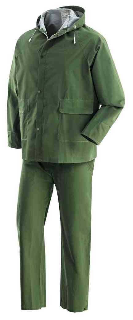completo giacca e pantalone in PVC -poliestere-PVC. Peso 390 g/mq, spessore 0,30 mm. GIACCA: Chiusura con cerniera ricoperta da patta e bottoni automatici. Cappuccio fisso con coulisse. Fori di aerazione sul dorso e sotto le ascelle. 2 tasche sul davanti con patta antipioggia. Fondo manica con bottoni automatici. PANTALONE: Elastico in vita. Apertura frontale con bottone automatico. Bottoni automatici alle caviglie. CE Ia categoria. Colore verde. Taglia XL