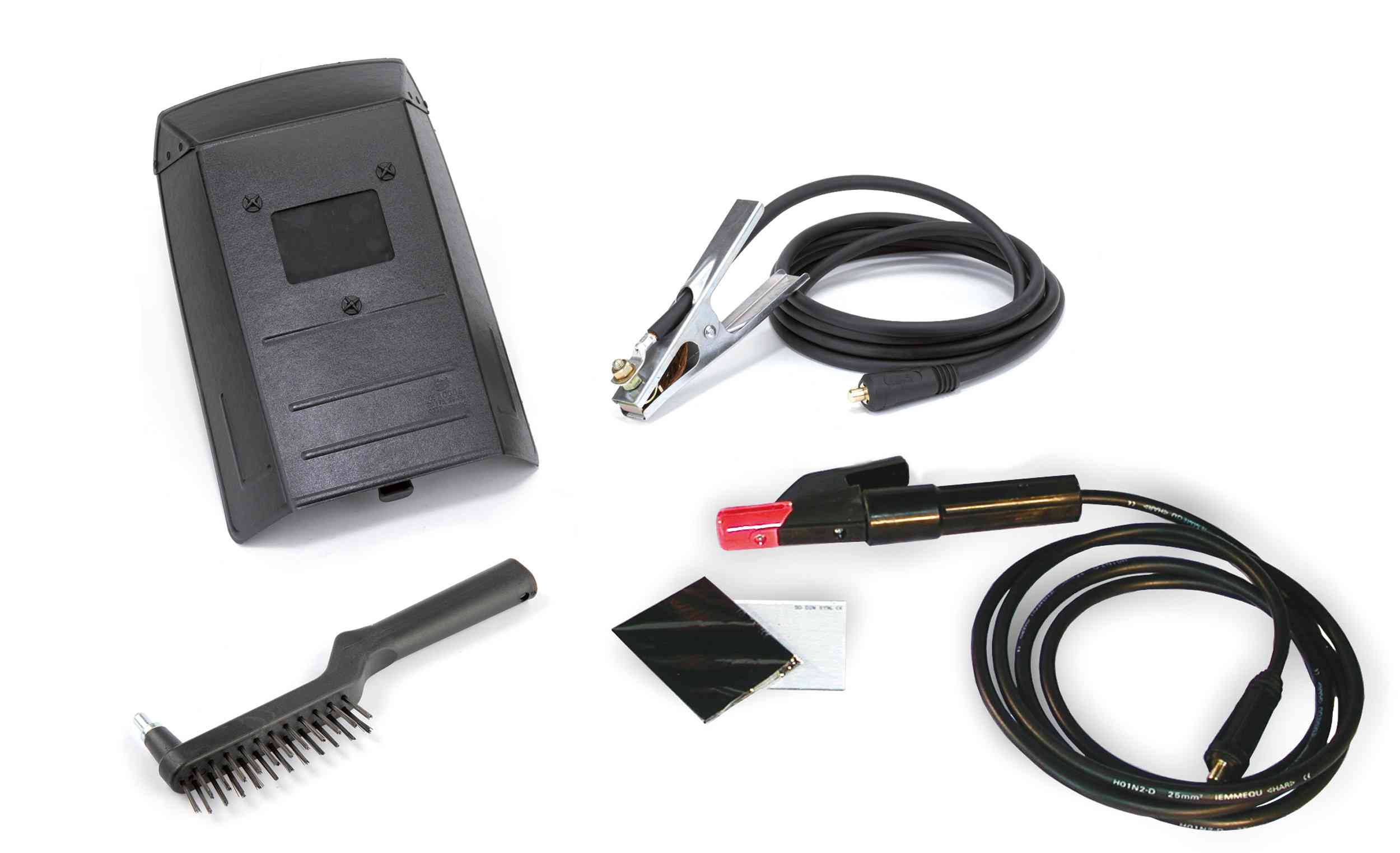 per saldatrici fino a 150 A Composto da: - schermo - vetrino inattinico colorato - vetrino incolore - pinza portaelettrodi - morsetto di massa - capicorda - 5 m di cavo sezione 16 mm2 - martospazzola Costruito a norma CE