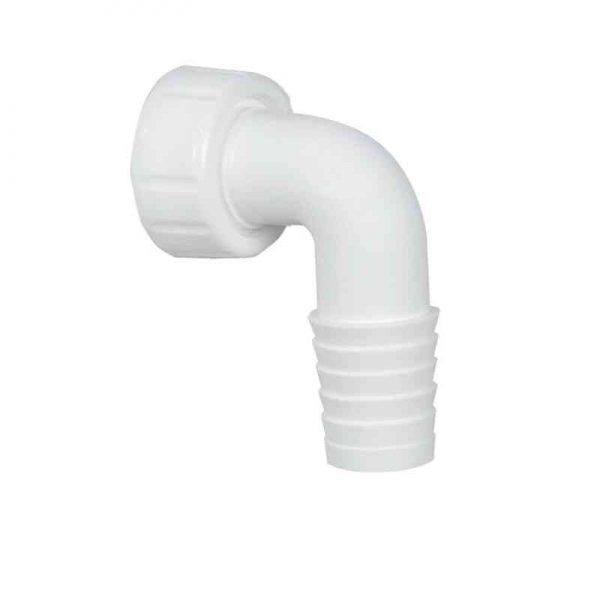 raccordo tubo scarico curvo in PVC con ghiera girevole. Attacco F 1 + portagomma conico 20/25 mm. Adatto per sifone lavatrice ad incasso. Colore bianco. Dimensioni 59 x 74 x h 43 mm.