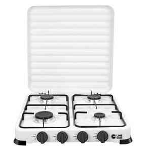 Fornello portatile a gas quattro fuochi in acciaio smaltato, con coperchio, supporti antivibrazione in gomma, alimentazione a gas GPL, potenza fornello piccolo 1 kW - 2 fornelli medi 1,5 kW - fornello grande 2.2 kW, potenza complessiva 6.2 kW, valvole in rame, griglia di supporto smaltata ad alta resistenza dimensioni cm 50x53x8. Peso 4 kg. Per uso esterno.