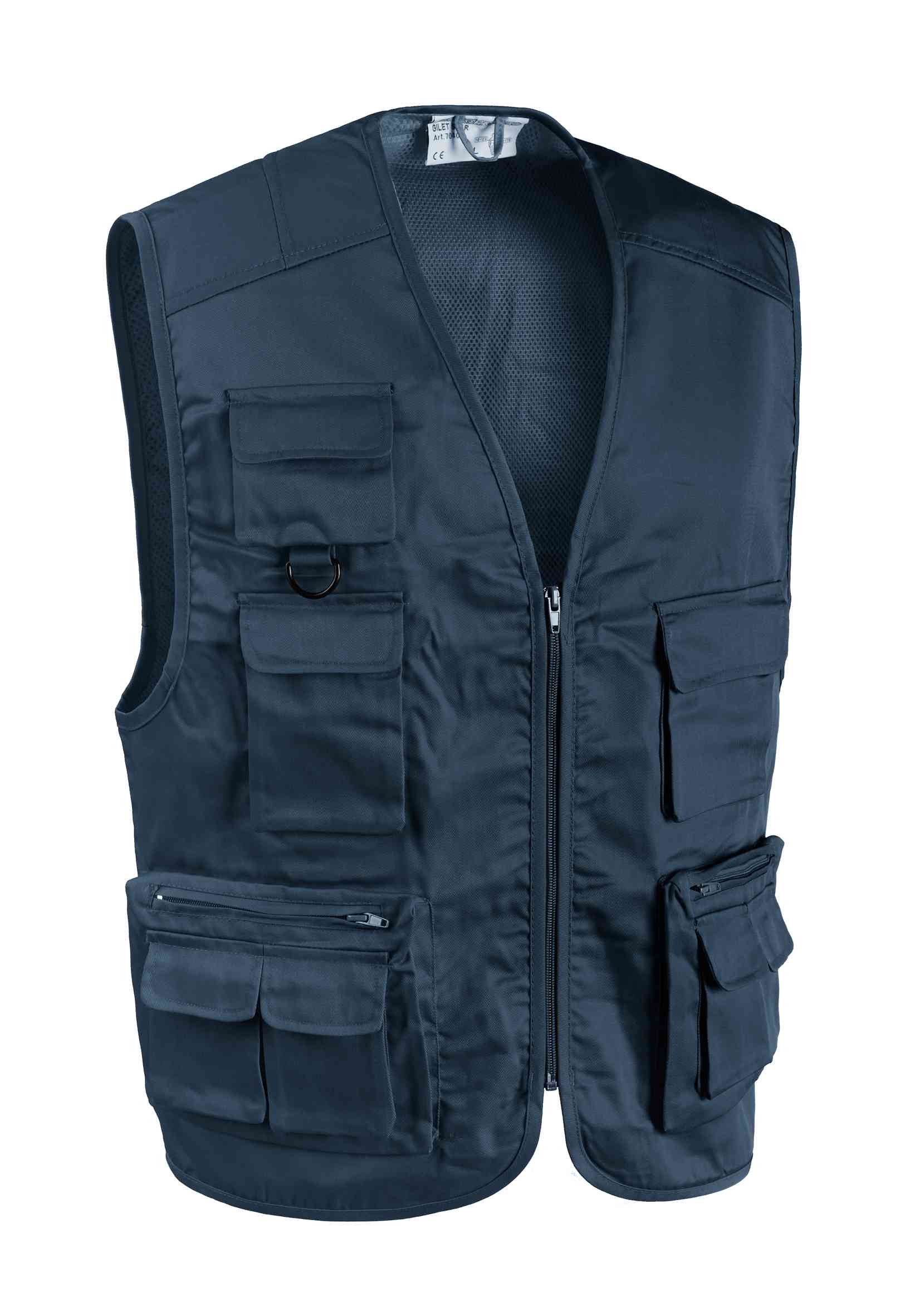 Mod. STAR 80% poliestere, 20% cotone, peso 200 g/mq Retinatura interna. Collo a V, 2 tasche posteriori, 8 tasche esterne, tasca porta cellulare Taglia M Colore blu