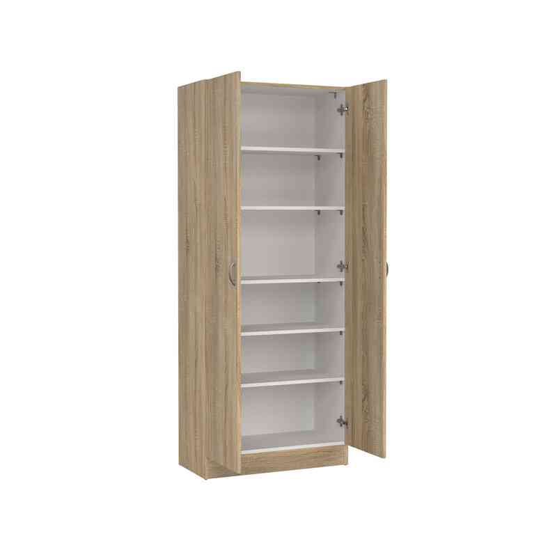Armadio/scarppera mulituso a 2 ante e 5 ripiani regolabili. Dimensioni 69,2x34,6x170,4 cm. Colore quercia. Peso 37,3 kg.