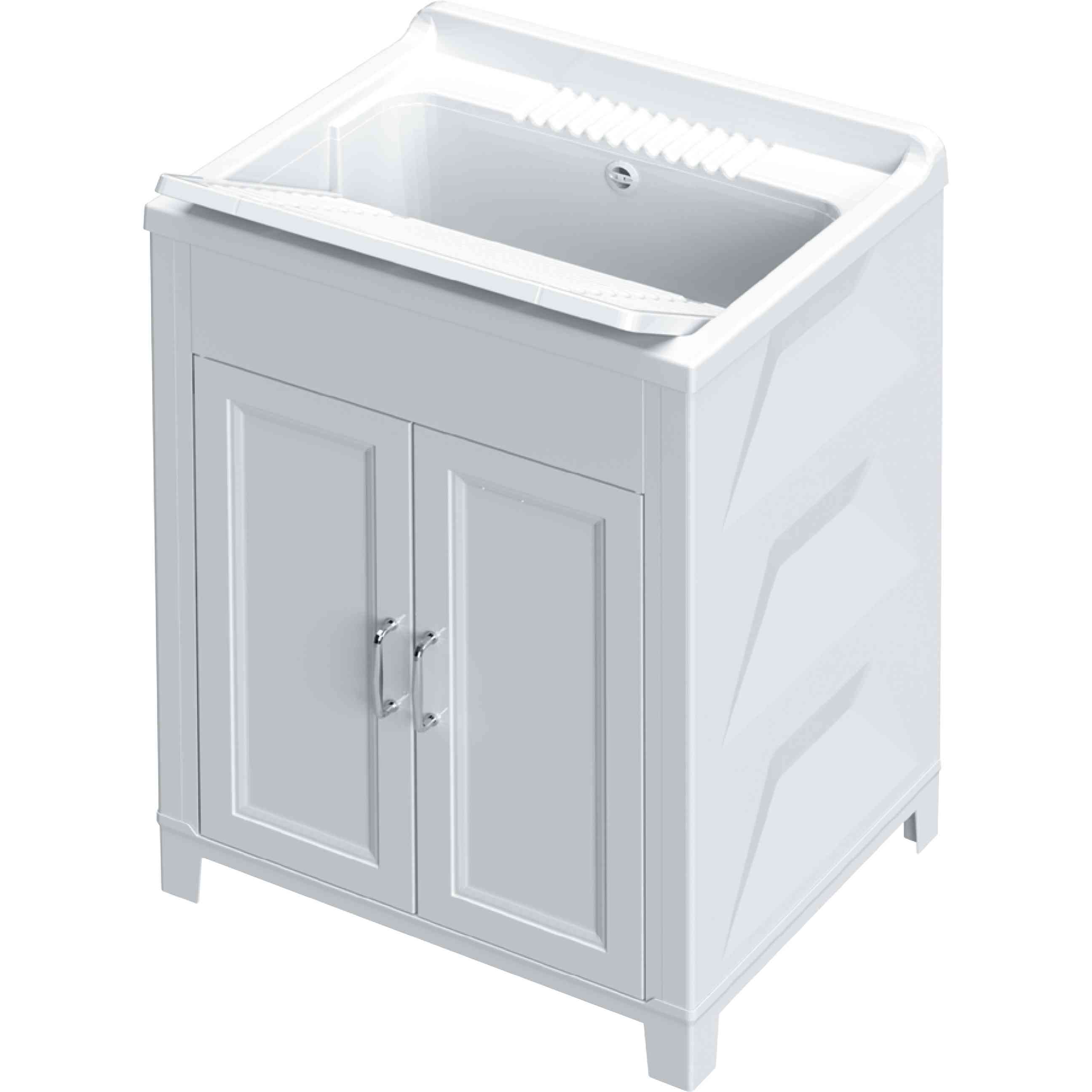 Mobile con lavatoio ad anta singola, vasca e asse di lavaggio in resina P.P. Stampaggio a iniezione, struttura in resina PVC E P.P. Sifone a 1 via con troppopieno e piletta, inclusi nella confezione. Maniglie in ABS cromo. Assemblaggio semplice e rapido (senza viti). Vasca e tavoletta lavaggio in polipropilene resistente agli acidi. Piedini regolabili. Indicato anche per esterni. Dimensioni 60 x 50 x h 85 cm. Colore bianco.