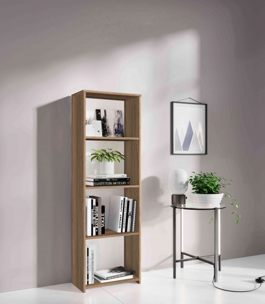 E' una libreria-scaffale slim a quattro vani dal design moderno da parete. Struttura realizzata in truciolare facile da montare. Dimensioni 45 x 25 x h 138 cm. Colore rovere barly.