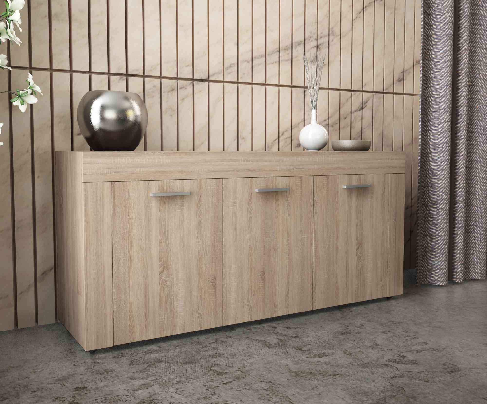 a 3 ante. Pannello truciolare in melaminico 15 mm. Facile da montare. Dimensioni 157 x 41 x h 82 cm. Colore legno naturale