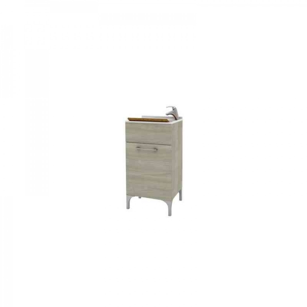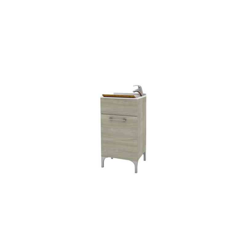 Mobile lavanderia in legno. Vasca e tavoletta in polipropilene resistente agli acidi. Completo di sifone. Predisposto per il montaggio del rubinetto monocomando (non compreso). Da montare. Dimensioni 45 x 50 x h 84 cm. Finitura rovere grigio
