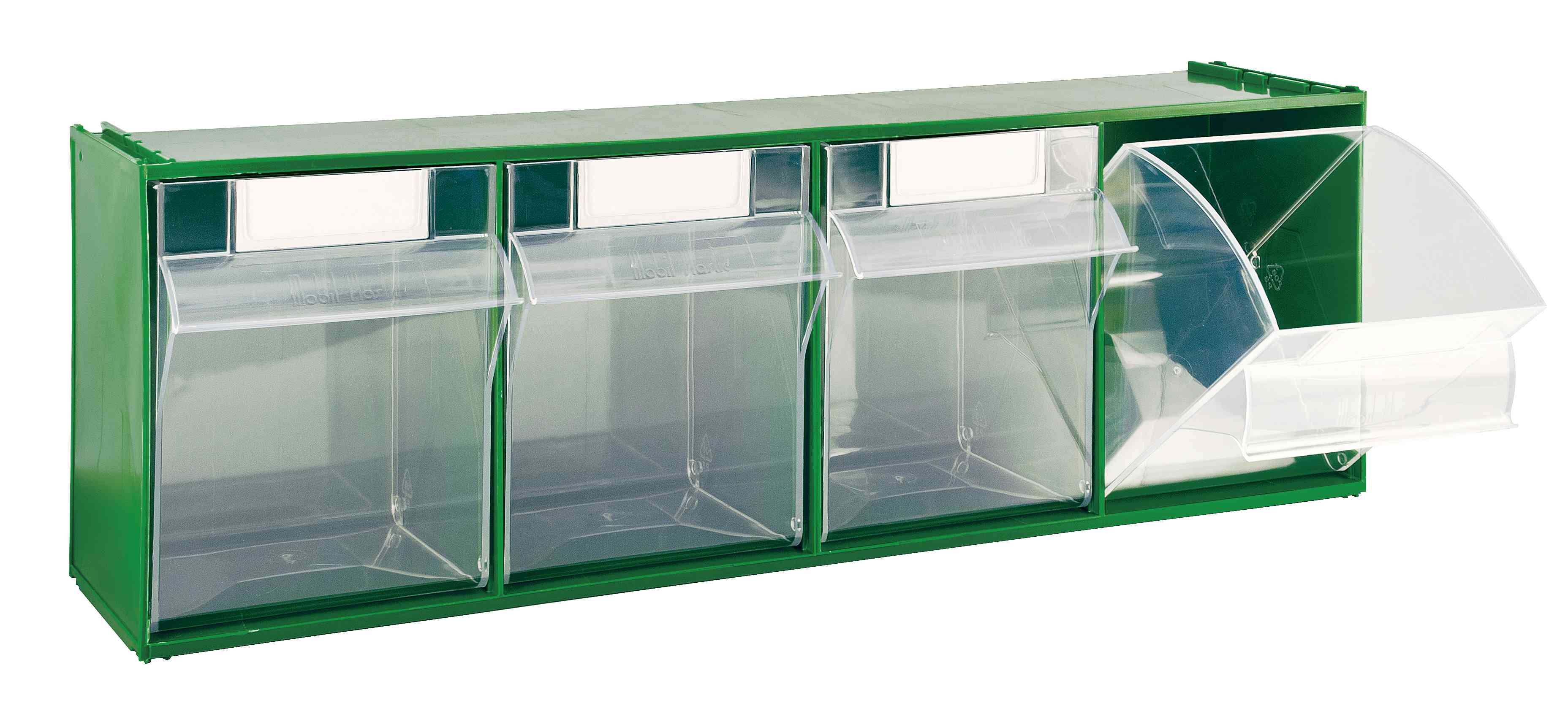 Mod. MADIA in resina termoplastica. Cassetti trasparenti estraibili ad apertura basculante. Sovrapponibili. Cartellini in dotazione. 4 cassetti Dimensioni mm 600x178x206h