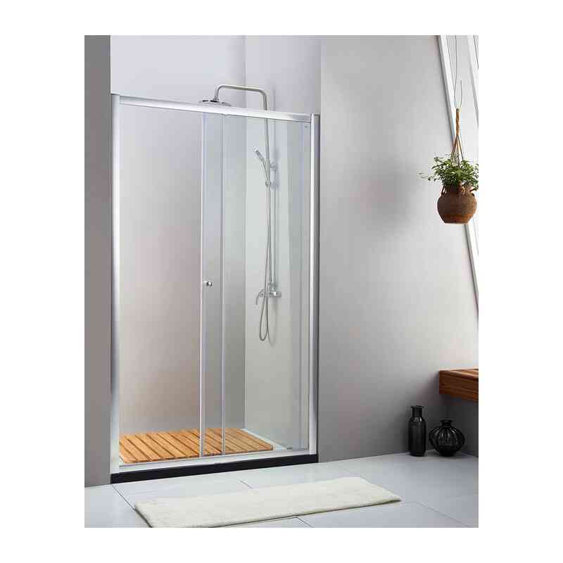 Parta scorrevole in cristallo trasparente con spessore da 6 mm. Profili in alluminio cromato liscio. Meccanismo di apertura - chiusura scorrevole su rotella singola superiore e inferiore. Maniglia a pomolo. Altezza 190 cm. Estensibilit 98 x 102 cm.