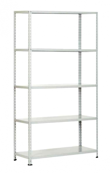 in lamiera verniciata colore grigio. Con aste intere. Cinque ripiani con 1 rinforzo. Con bulloni e piedini. Portata 80 kg per ripiano. Dimensioni cm 120x40x196h