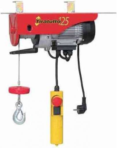 Modello TT 125 sollevatore con radiocomando wireless con 2 batterie alcaline AA. Potenza motore 450W. Tensione 230V - 50 Hz. Portata Max (tiro semplice) 100 kg. Portata Max (tiro doppio) 200 kg . Tiro utile 11 m (tiro semplice). Tiro utile 5,5 m (tiro doppio). Velocita' di salita (tiro semplice) 10 m/min. Velocita' di salita (tiro doppio) 5 m/min. Staffe per fissaggio con viterie. Fune