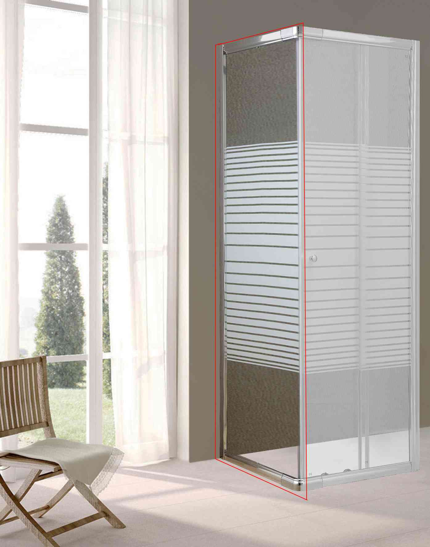 Lato fisso doccia con profili in alluminio cromato liscio, parete in cristallo trasparente serigrafato da 6 mm. Altezza 185 cm. Estensibilit