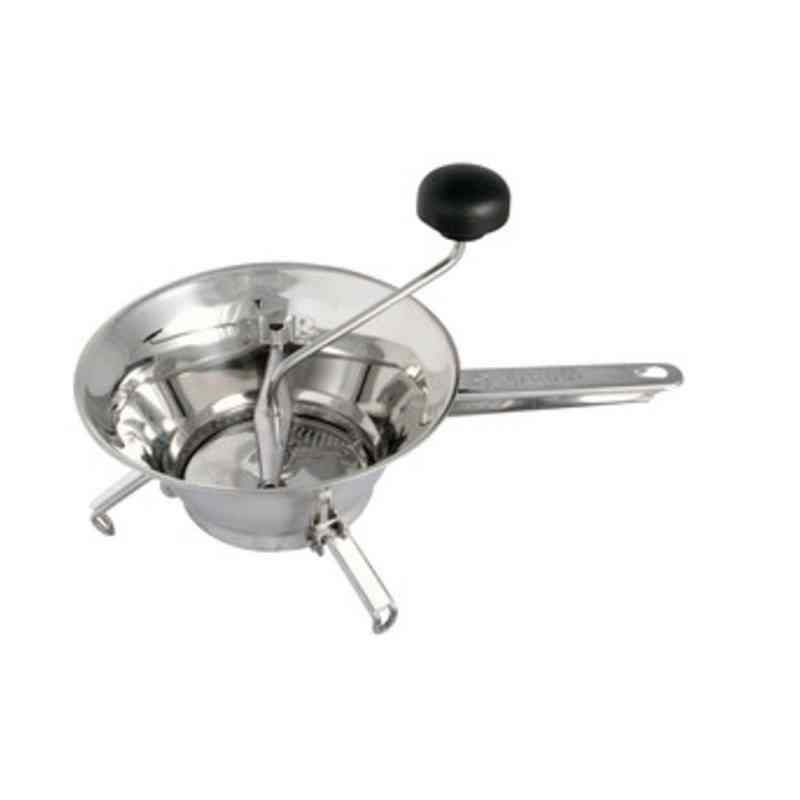 realizzato in acciaio inox 18/10. In questa versione dispone di due piedini fissi per il posizionamento su recipienti di diversa capienza. Dimensione 24 cm, con tre dischi in acciaio inox con fori differenziati.