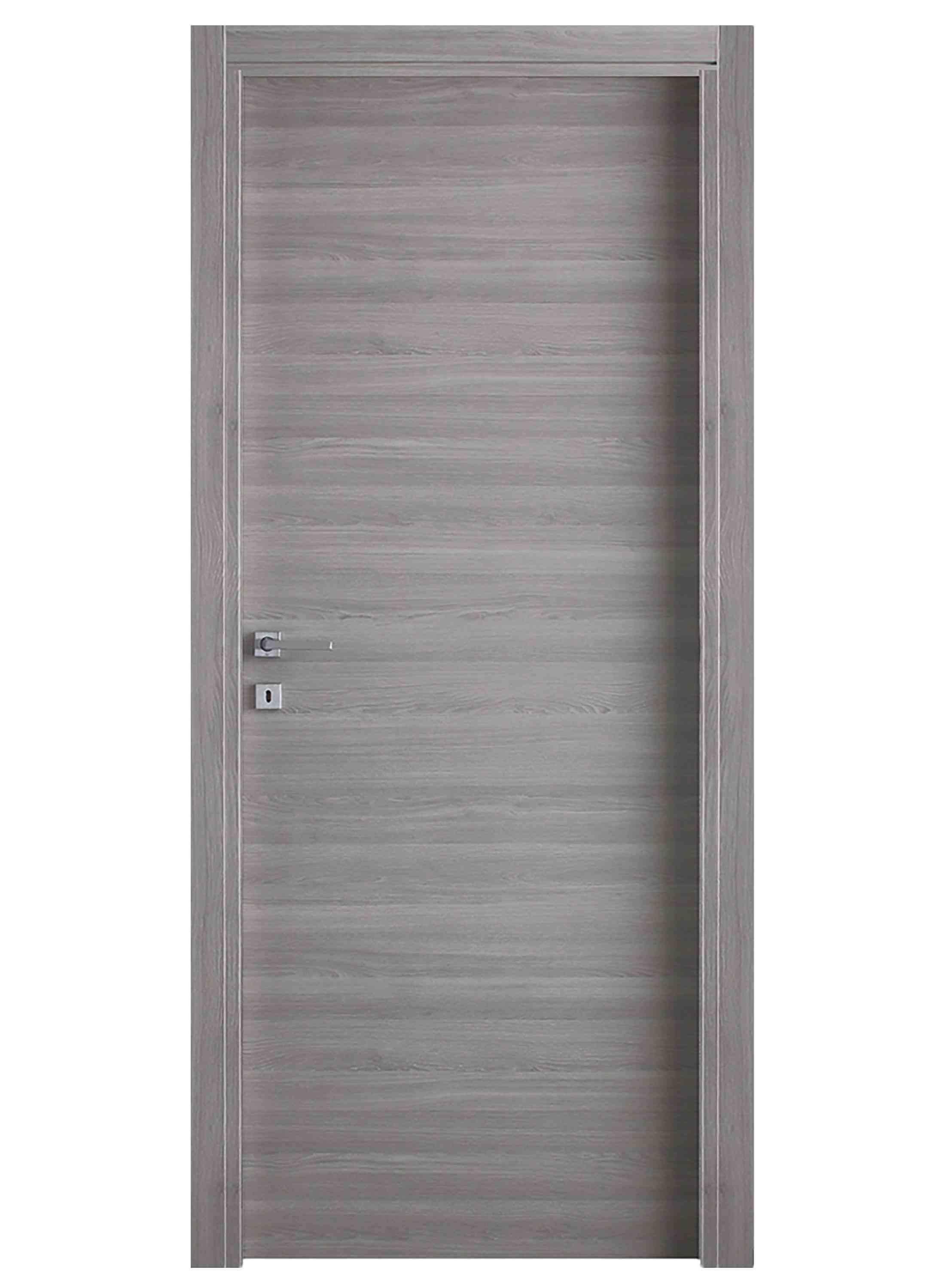 porta tamburata spessore mm.44 intelaiata con massello di abete mm.28x40 ripempimento con nido dape microforato placcato con pannelli mdf spessore 3/4 mm rivestiti in micro laminato telaio piatto mdf sepssore mm.40 con guarnizione in battuta antirumore completo di cornici di sezione mm.70x10 con serratura. Scorrevole. Dimensioni cm 80x210 Colore grigio