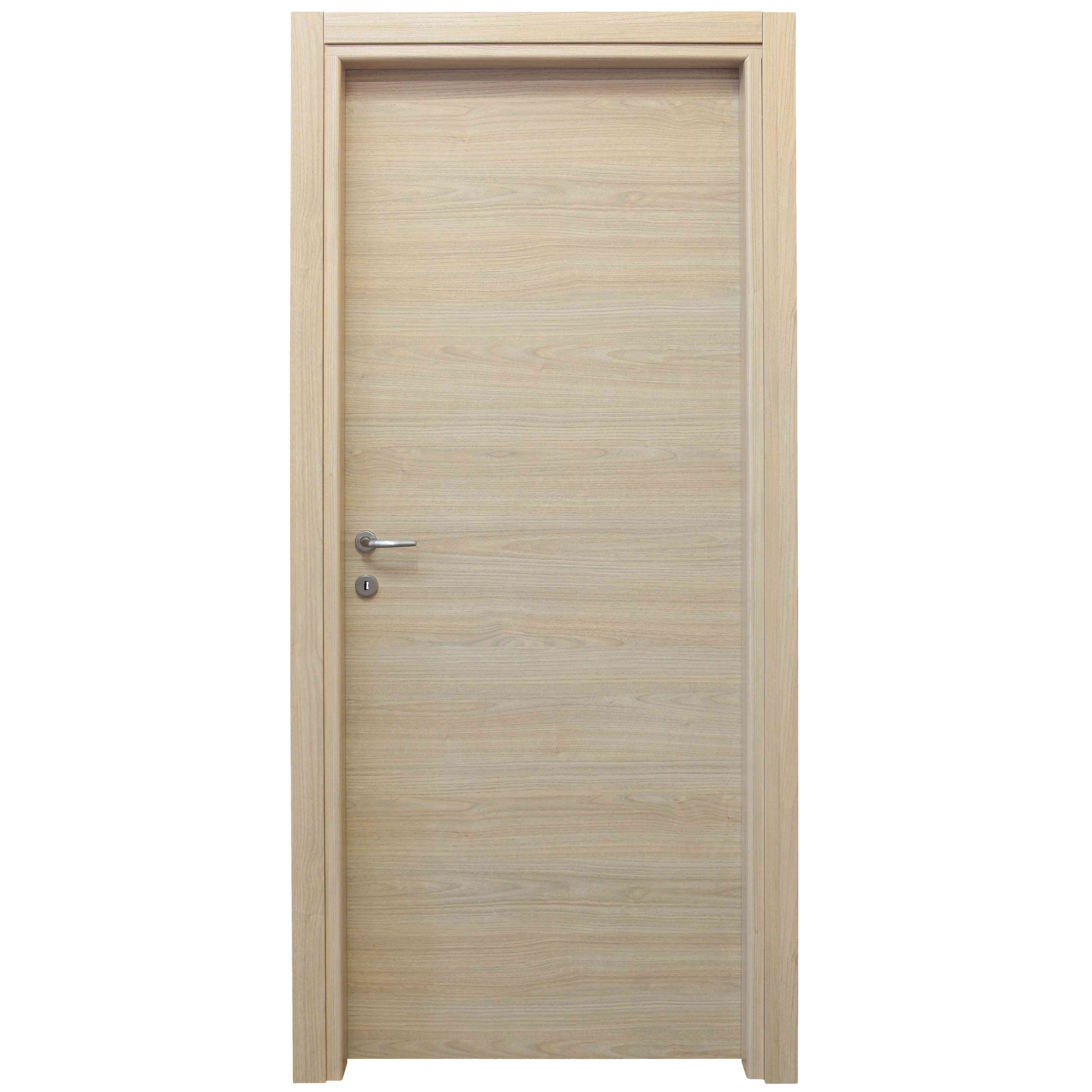Anta telaio perimetrale compreso di rinforzi in massello di abete. Riempimento in cartoncino trattato. Piani in MDF nobilitato con microlaminato. Bordatura sui 4 lati in melaminico. Spessore 44 mm. Reversibile. Telaio traverso e montante composto da MDF. Rivestimento con microlaminato. Guarnizione di battuta trasparente in gomma. Coprifilo esterno ed interno in MDF da 60 mm spessore 8 mm per fasce laterali e per fasce trasversali con aletta telescopica, rivestimento con microlaminato. Ferramenta serratura senza scrocco (fornito a parte), montata, finitura verniciata silver. Cerniere anuba D 13 mm zincate. Kit composto da: viti, chiave, scrocco (in nylon), incontro. Maniglia fornita a richiesta. Imballo tre cartoni Dimensioni 90 x 210 cm. Colore Rovere sbiancato