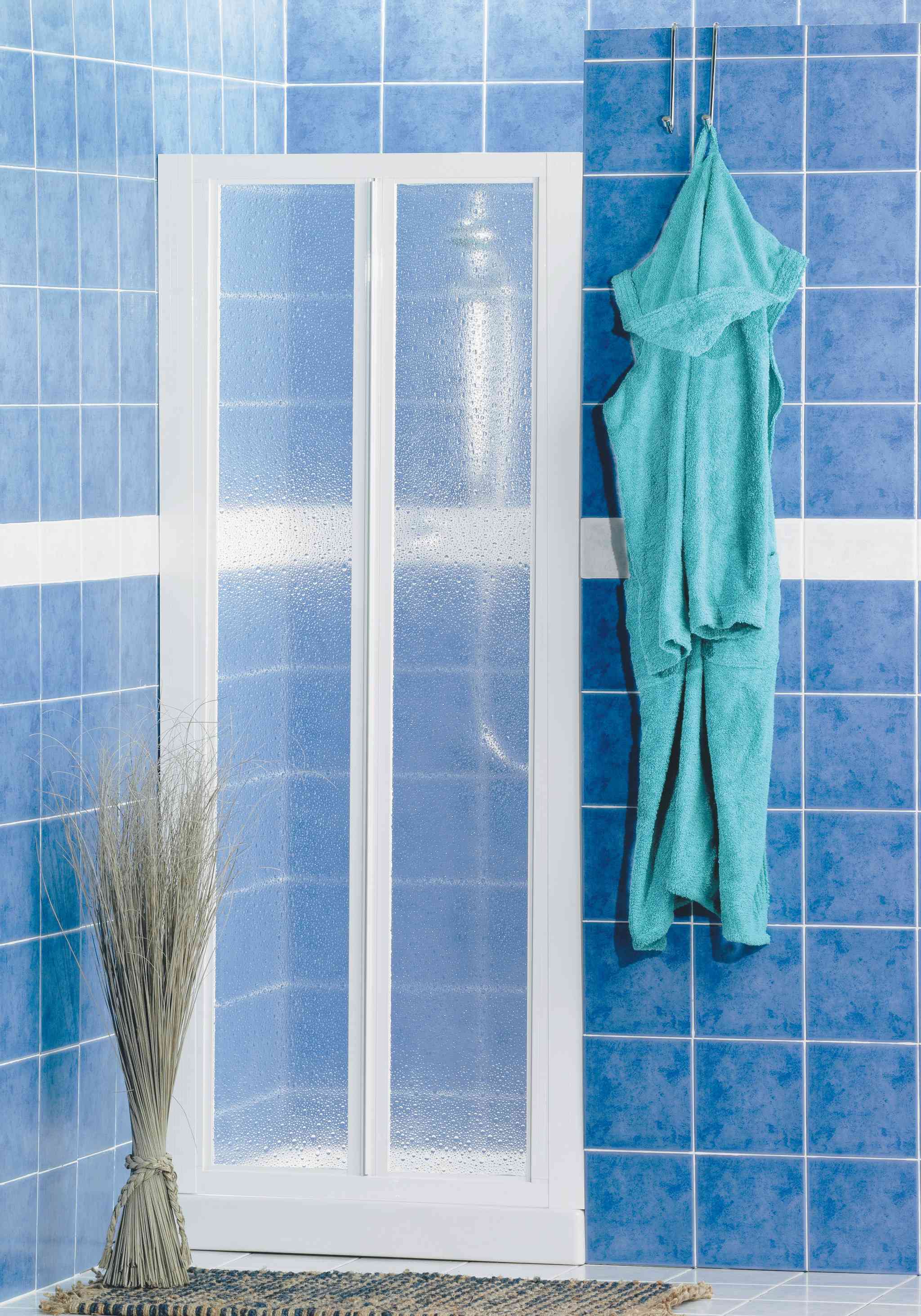 Per box doccia, porta due ante a soffietto con scorrimento su pattini in nylon. Profili maggiorati in alluminio verniciato bianco. Pareti in crilex con finitura lastra bollicine. Apertura 68 cm. Estensibilit