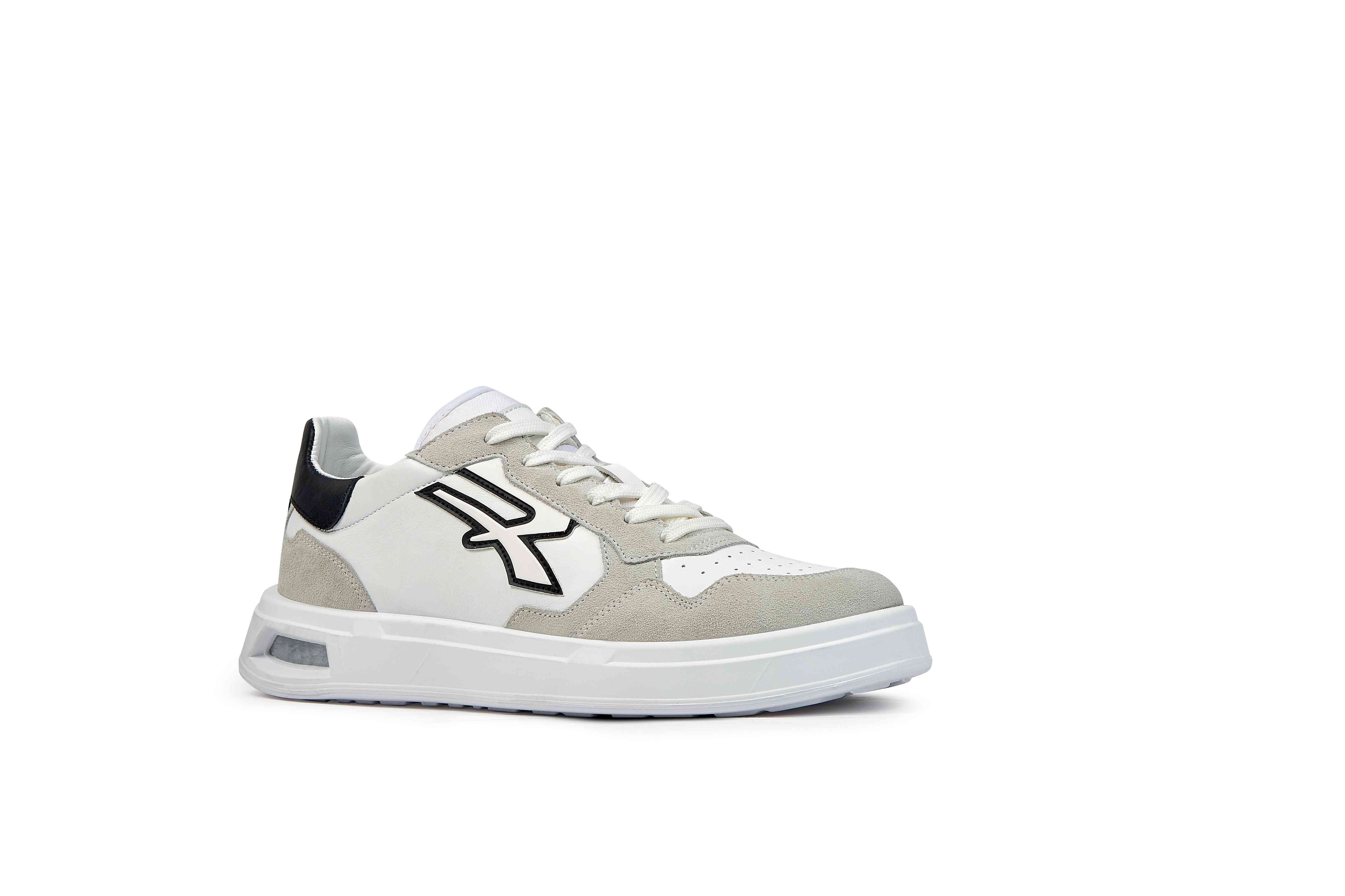 Tomaia in morbida pelle bianca e suede. Fodera interna in pelle bianca e spugna di cotone. Linguetta in tessuto. Punta traforata per garantire maggiore traspirabilit
