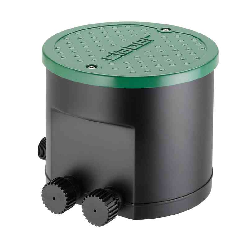Pozzetto a tenuta stagna, contenente - 1 programmatore a batteria e 4 elettrovalvole- 5 tappi filettati in dotazione per le uscite non utilizzate.- 4 solenoidi bistabili. Portata delle linee max 25 l/min a 2,5 bar. Pressione di esercizio min 1 - max 6 bar. Temperatura di esercizio 3 - 60