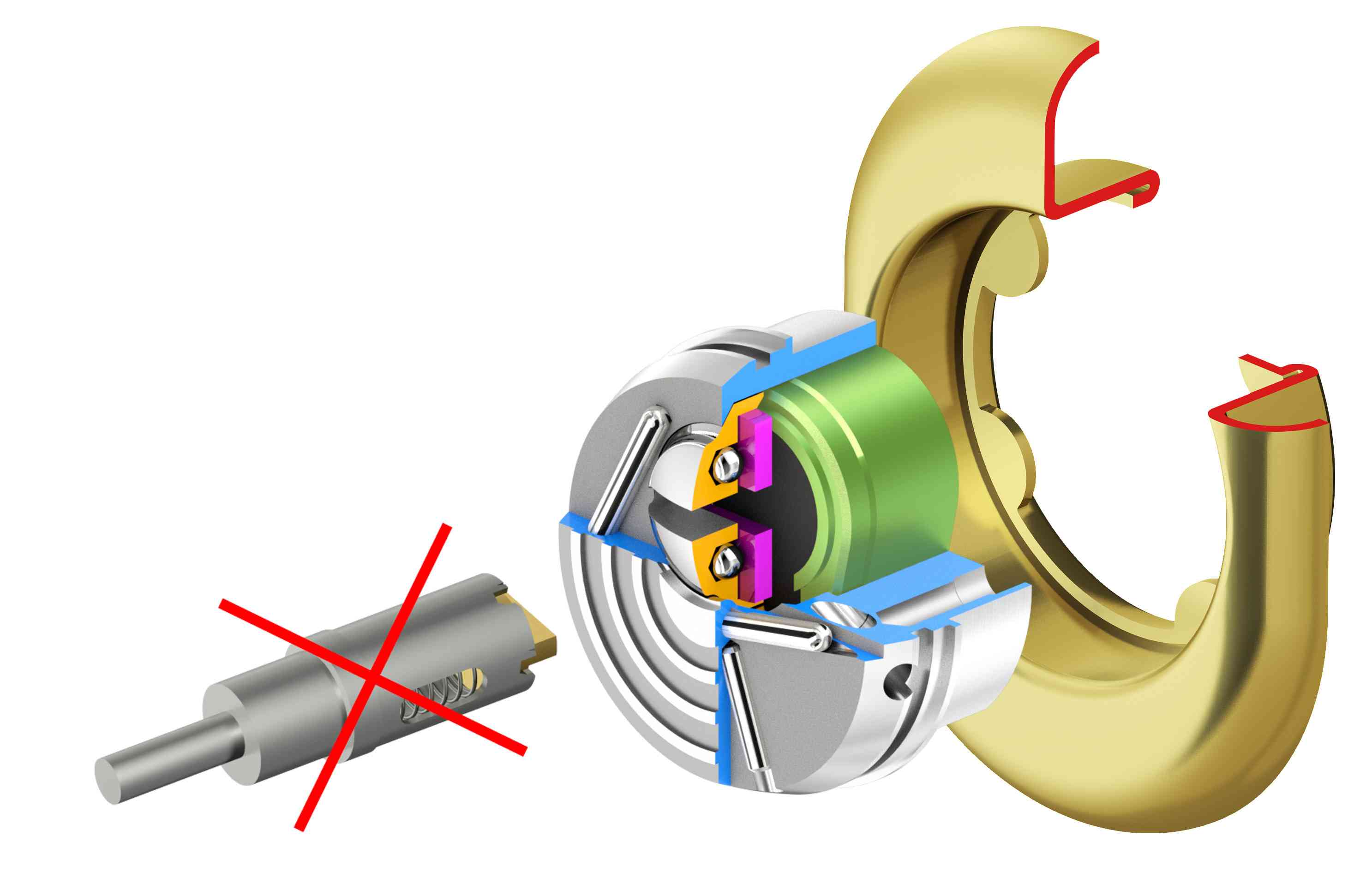 Mod. MONOLITO KRIPTON BKS 200 corpo in acciaio temperato e copertura in ottone. Protezione anti-fresa con inserti cilindrici in metallo duro (Widia). Rosetta in acciaio inox antistrappo regolabile in altezza. Per pannellature di spessore 11 mm Finitur