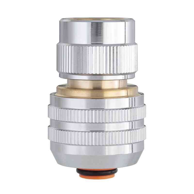 In ottone cromato. Dotato di valvola per larresto automatico dellacqua, si monta nella parte terminale del tubo scollegando laccessorio, il flusso dellacqua si blocca. Provvisto di 6 sfere interne per assicurare un innesto automatico con una tenuta perfetta