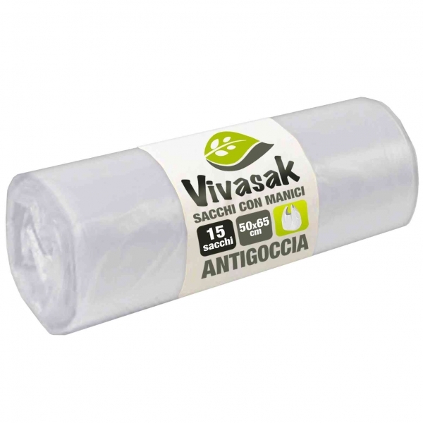 SACCHI PER RACCOLTA DIFFERENZIATA .ROTOLI DA 15 PEZZI CON MANICI. POLIETILENE MEDIA DENSITA.COLORE NEUTRO