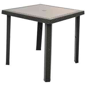 Tavolo in polipropilene effetto rattan adatto ad uso esterno. Non necessita di viti per il montaggio. Imballo singolo in termoretraibile. Dotato di foro centrale per alloggio ombrellone . Piedi ad incastro .
