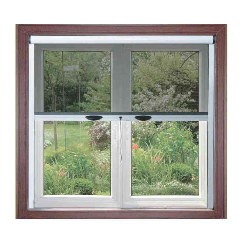 avvolgibile a molla con movimento rallentato tramite frizione verticale per finestra. Profilo in alluminio laccato, rete in fibra di vetro ricoperta di PVC grigio. A rullo, completa di guide laterali. Riducibile