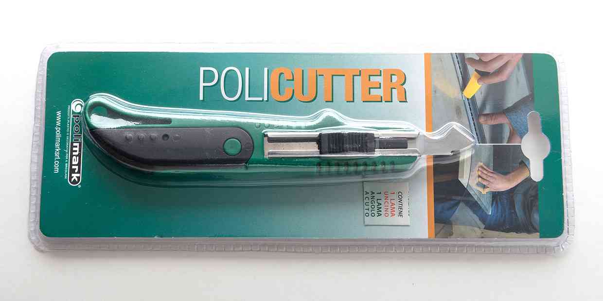taglia vetro sintetico realizzato in PVC munito di blocco lama e 2 lame di ricambio. Per tagliare ed incidere, la mezzaluna della lama