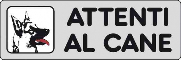 cartello Attenti al cane. Adesivo bianco. Dimensioni 150 x 50 mm.