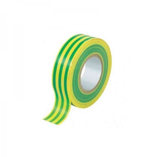 adesivo in gomma naturale con supporto di PVC plasticato. Spessore 150 . Autoestinguente. Resistente fino a max 7.000V. Altezza 19 mm. Rotolo 25 m. Colore giallo/verde