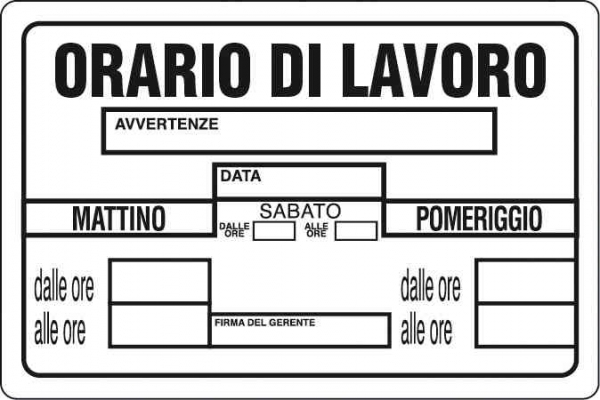cartello Orario di lavoro. Supporto in PVC. Dimensioni 30 x 20 cm.