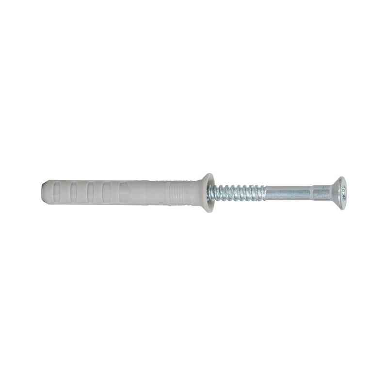 Mod. N6-40 S fissaggio a percussione. Vite a chiodo in acciaio zincato premontata testa svasata piana, impronta PZ con tassello in nylon gi premontati. Corpo prolungato con collare svasato. Diametro foro per lunghezza 6x40 mm.