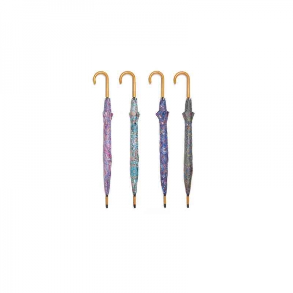 Ombrello lungo con apertura automatica della linea Qui non ci piove aste in fibra di vetro. Tessuto nylon in 4 fantasie donna. Impugnatura chiara. Lunghezza 92 cm . Diametro 114 cm.