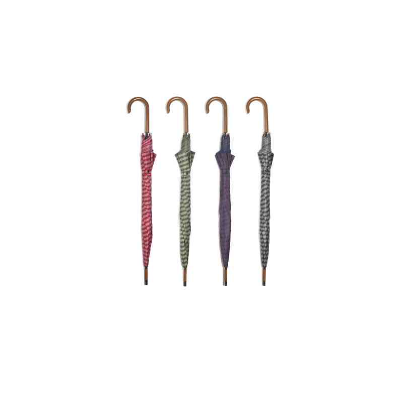 Ombrello lungo con apertura automatica della linea Qui non ci piove aste in fibra di vetro. Tessuto nylon in 4 fantasie uomo . Impugnatura chiara. Lunghezza 92 cm. Diametro 114 cm.