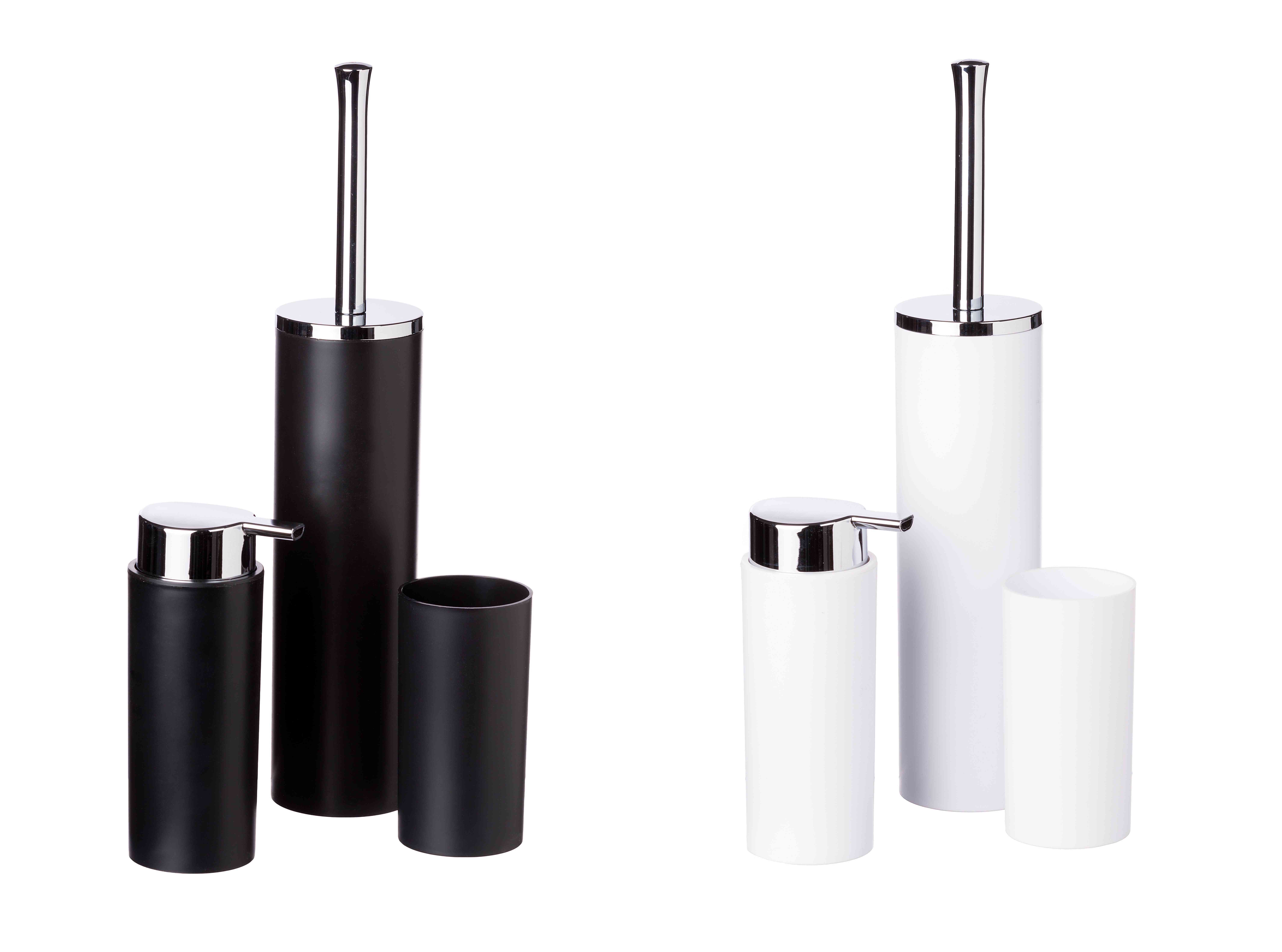 Set da appoggio in plastica composto da: Bicchiere adatto per spazzolini da denti e pennelli da trucco dal corpo. Portascopino wc con ciuffo in setole d'appoggio con contenitore realizzato in resina. Dosatore porta sapone liquido con erogatore a pompa in plastica cromata e contenitore d'appoggio in resina. Colori assortiti.