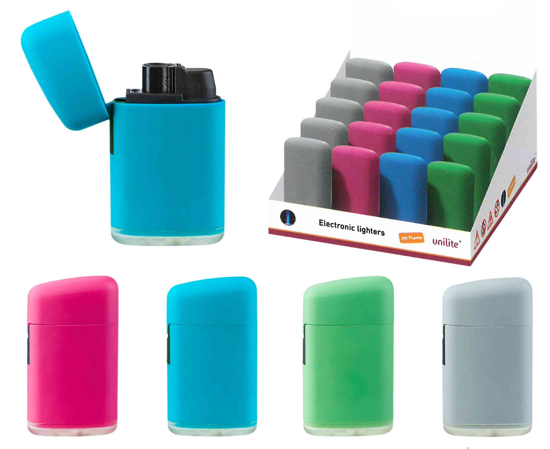 Mod. SOFT TOUCH A gas con fiamma antivento. Ricaricabile. Colori assortiti.