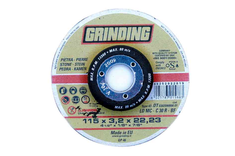 a centro depresso. Abrasivo al carburo di silicio. Per il taglio, l'aggiustamento e la posa in opera di marmi, pietre e materiali da costruzione in genere. Foro 22,2 mm Spessore 3,2 mm Diametro 115 mm