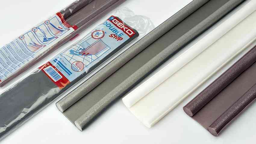 In polietilene espanso e tessuto impermeabile. Si applica facendolo scivolare sotto l'anta della porta in modo che guarnisca e dia una doppia protezione