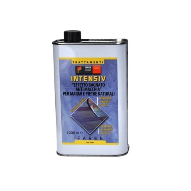 Intensiv è un trattamento anti macchia ad effetto bagnato, specifico per pavimenti levigati o grezzi in marmo, granito e pietre naturali. Altamente consigliabile per marmi anticati e ciottoli, il prodotto conferisce una gradevole tonalità calda alla pietra, esaltandone i colori e venature. Il trattamento rende la superficie idro-oleorepellente, non ingiallisce e resiste ai raggi UV. Per pavimenti, colonne, tavoli, davanzali, balconi in marmo e pietra naturale. Base solvente.