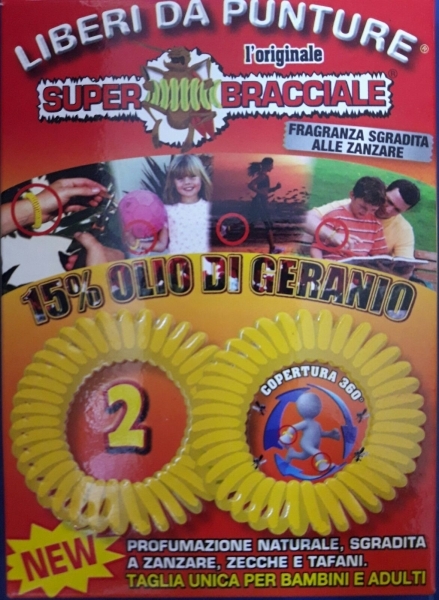 Confezione da 2 pezzi di Super Bracciale in poliestere elastico a forma di spirale ad uso umano, quindi idoneo al contatto con la pelle, facile da indossare, puo essere utilizzato sia alla caviglia che al polso. Contiene il 15% di olio di geranio filippino, il 5% di essenza di limone indonesiano ed il 2% di olio di citronella. Il prodotto e' naturale al 100% e non tossico, non unge ed e' inoltre resistente all'acqua. Grazie alla miscela delle sue essenze, allontana le zanzare nell'arco di 2 metri. Esso ha una durata di oltre 200 ore. Taglia unica ideale per bambini e adulti. Colore Giallo. Ideale anche contro mosche e zecche.