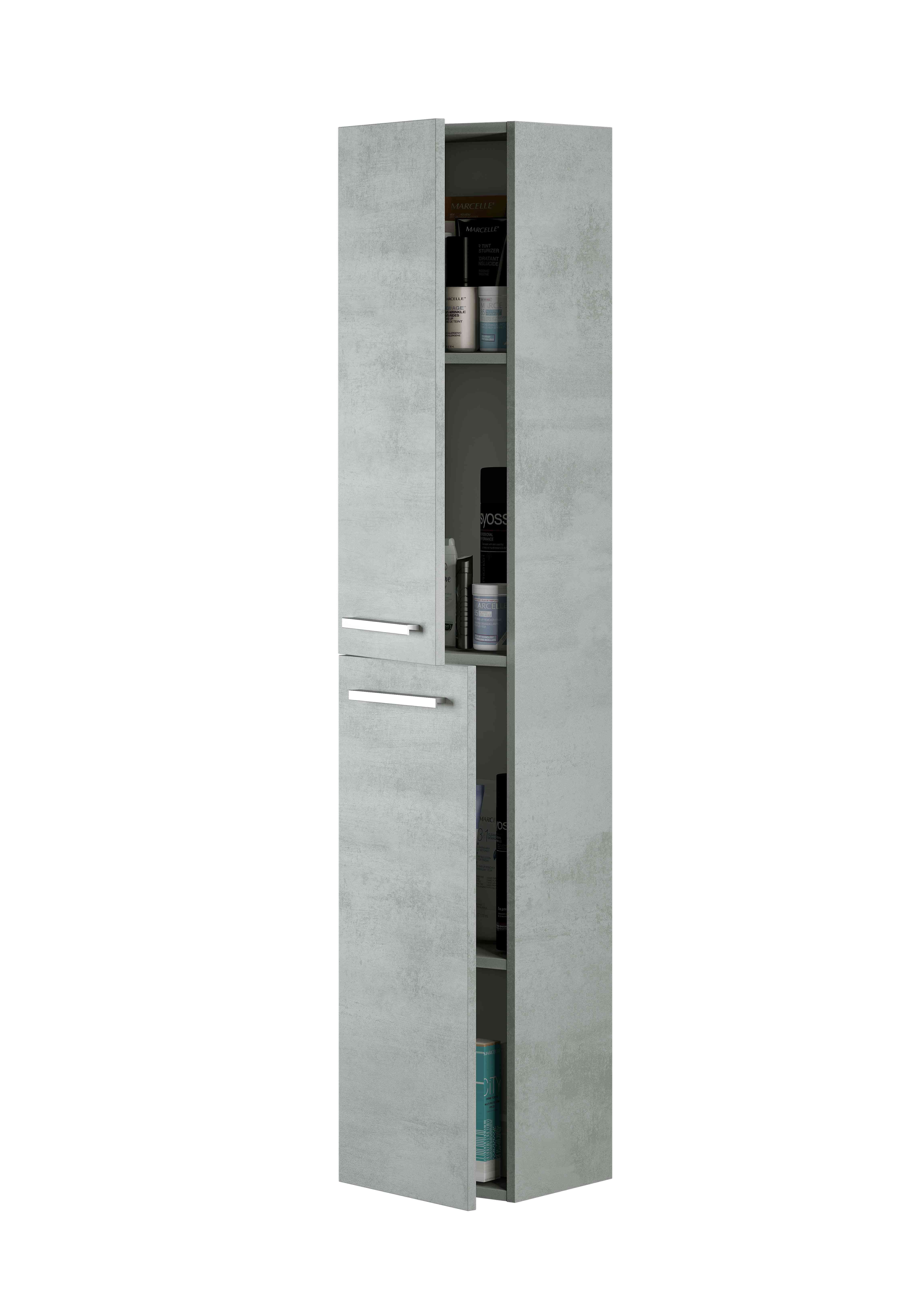 pratica colonna da bagno sospesa a due ante a 4 ripiani interni regolabili in altezza. Le ante di possono montare con apertura a destra o a sinistra. Struttura in truciolare melaminico spessore 15 mm. Sistema di supporto in metallo. Cerniere in metallo. Maniglie in alluminio anodizzato con effetto lucido. In kit da montare. Dimensioni 30 x 25 x h 150 cm. Colore cemento. Peso 16,3 Kg