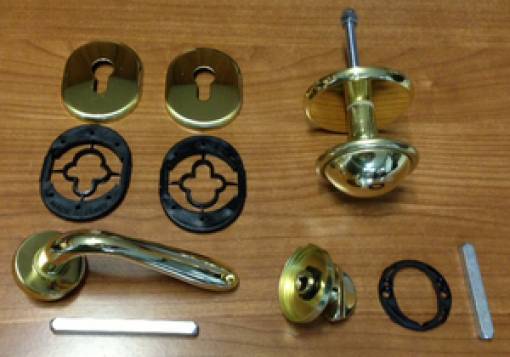 composto da: mezza maniglia e pomolo esterno in zama, 2 bocchette in ottone, con sottobocchette in nylon, limitatore di apertura in zama. Per serrature a cilindro europeo. Mano DX Finitura cromo satinato