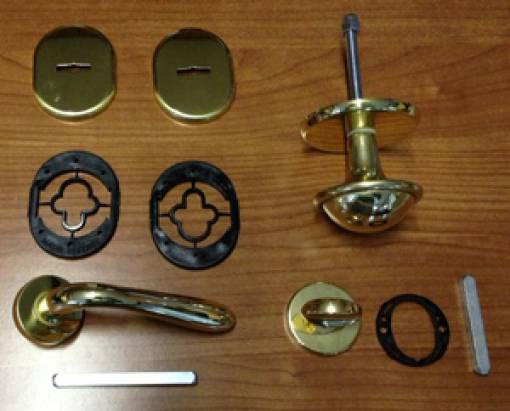 composto da: mezza maniglia e pomolo esterno in zama, 2 bocchette in ottone, con sottobocchette in nylon, limitatore di apertura in zama. Per serrature a doppia mappa. Mano SX Finitura oro lucido
