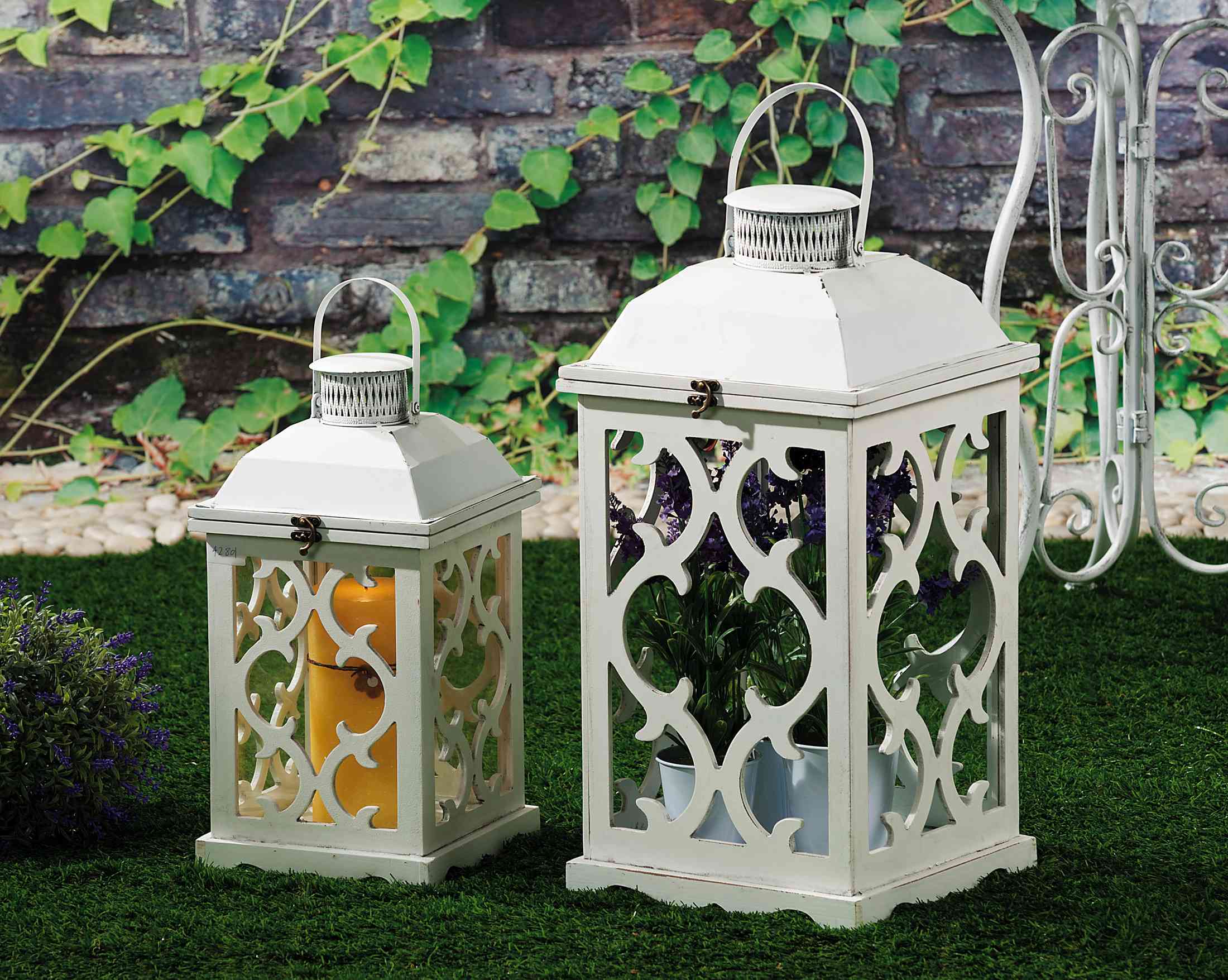 in legno e metallo. set 2 pezzi. Fornita senza candela. Dimensioni cm 22x22x43h Dimensioni cm 28x28x57h