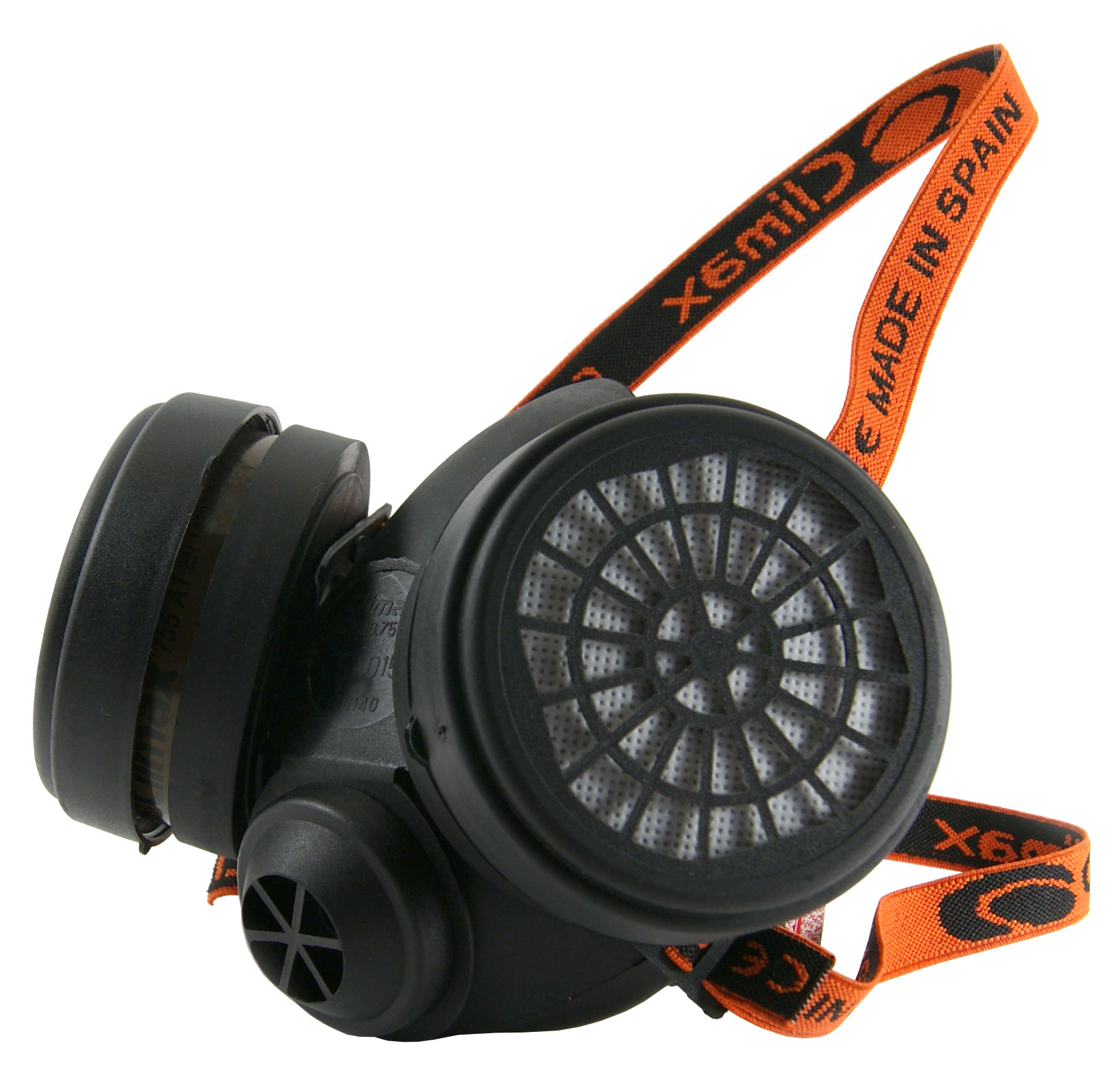 Mod. 755 A1 a 2 filtri, in gomma antiallergica. Completa di filtri chimici (A1) laterali e una valvola di esalazione centrale. Per ambienti con gas ed emissioni tossiche. A norma EN 140
