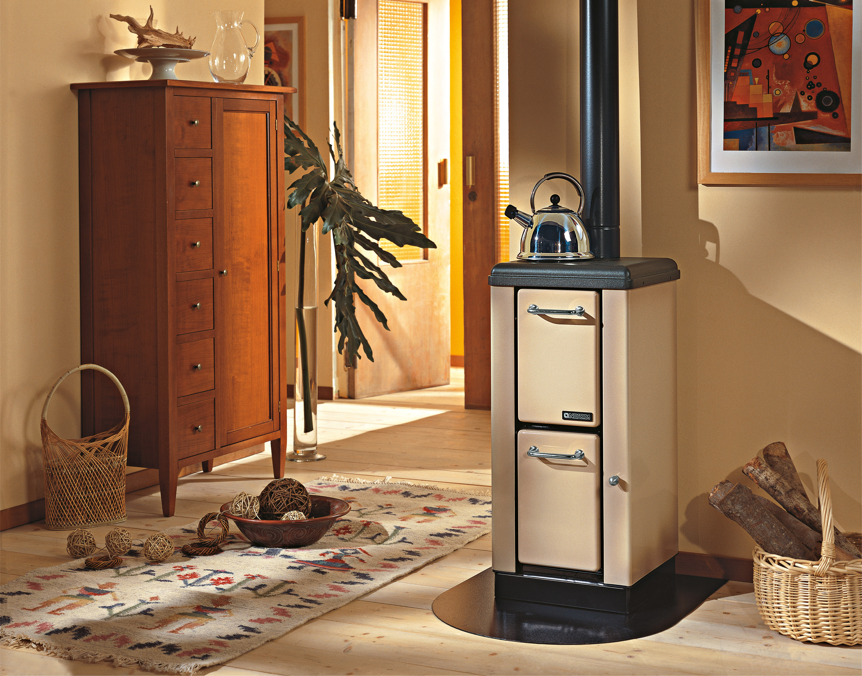 Mod. MIGNON potenza termica 4,0 kW volume riscaldabile115 m3 potenza termica globale 7,5 kW scarico fumi 10 cm peso 56 kg dimensioni 38x42x82h cm Rivestimento esterno in acciaio smaltato Testata in ghisa smaltata Maniglie cromate Scuo