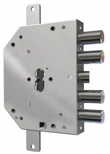 Mod. Y132 per porte blindate. Applicazione planare. Chiusura triplice con scrocco reversibile e 4 catenacci. Spina antitaglio su due catenacci. Corazza con viti passanti. Mano Sx Scatola mm 130x164 Entrata 60 mm Compatibile con serr. CR
