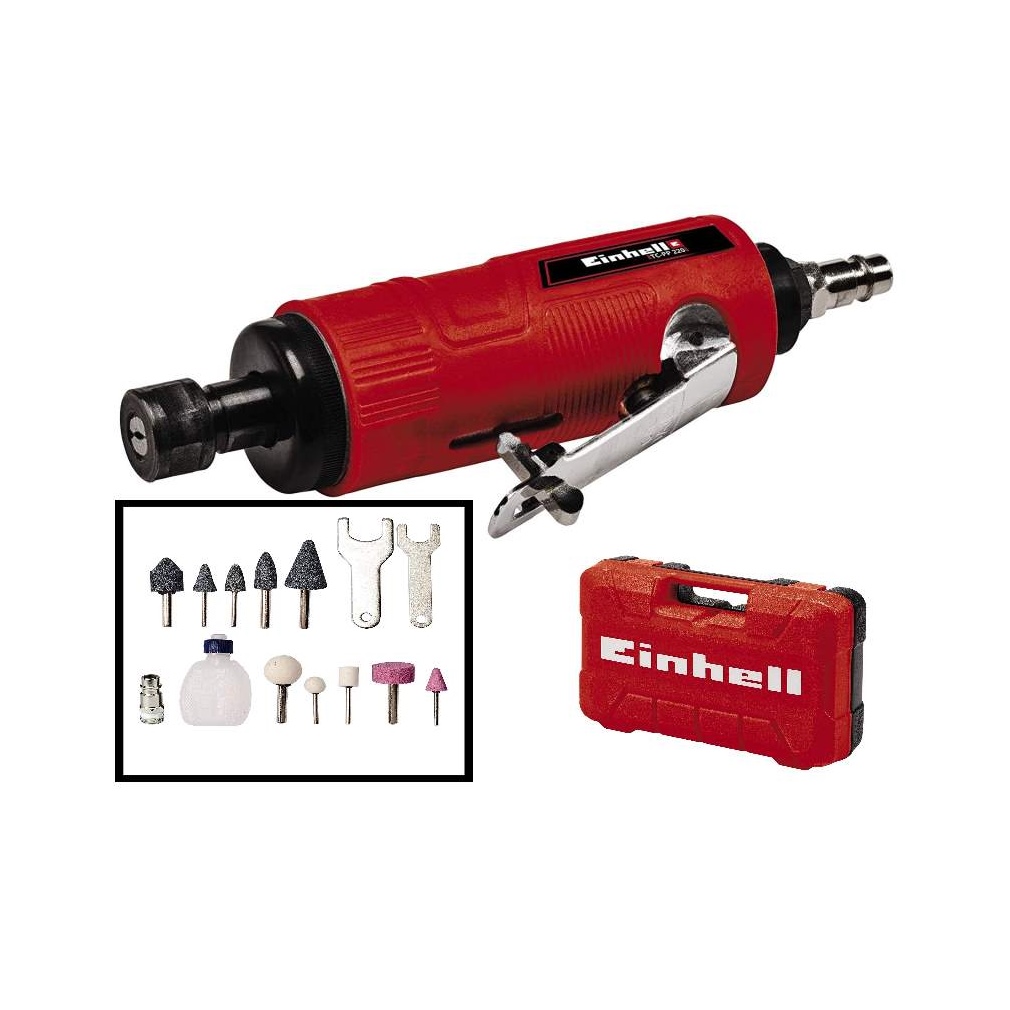 Con la smerigliatrice pneumatica diritta einhell tc-pp 220, l'ambizioso hobbista ha a disposizione uno strumento potente, in casa, in officina o in garage.con una velocità fino a 22.000 giri/min, consente levigatura, lucidatura, incisione o sbavatura precise e potenti.la smerigliatrice diritta einhell garantisce le migliori prestazioni a partire da un diametro interno del tubo flessibile di 9 millimetri.impugnatura di gomma è piacevole e salda da tenere in mano.la smerigliatrice pneumatica diritta è ottimizzata e adatta per l'uso con una sola mano.il dispositivo di sicurezza di cui è dotata impedisce l'accensione accidentale dell'apparecchio.i 10 perni di levigatura disponibili negli accessori consentono numerose possibilità di utilizzo.include 1 boccetta d'olio, 1 raccordo rapido e 2 chiavi a brugolafornita con valigetta di custodia e trasporto.